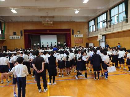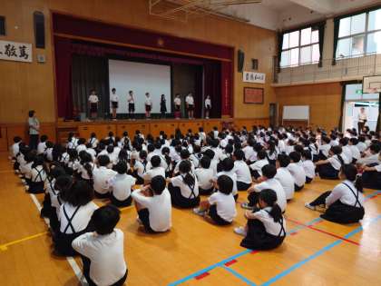 今日の児童集会は、たて割り班での伝言ゲームです。
