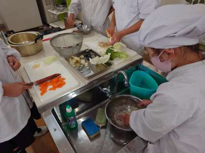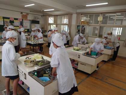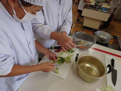 家庭科の調理実習でゆで野菜のサラダを作りました。