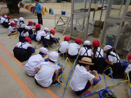 アサガオの本葉が出たので、追肥をして支柱を立てました。