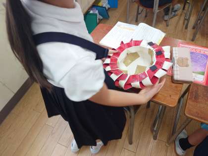 表現しやすいように、物語と同じようにおしゃれな赤い帽子を使って発表していました。
