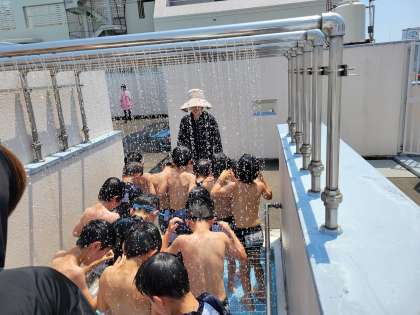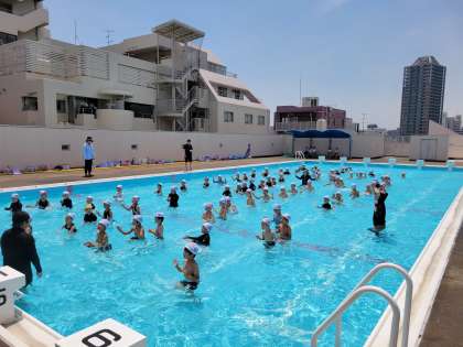 小学校の大きなプールに子どもたちは嬉しそうに早く入りたい様子でした。