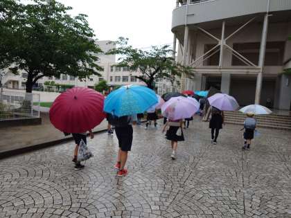今朝は雨の中の登校となりました。