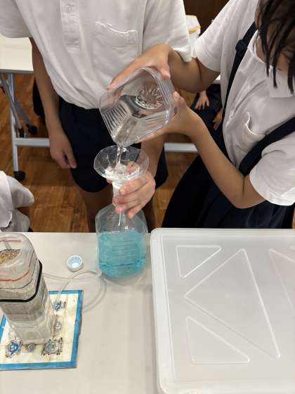 次に、オゾンや砂などを利用して、淀川の水の臭いや汚れをきれいにする過程を実験で確認しました。