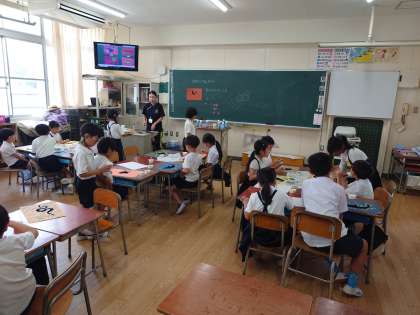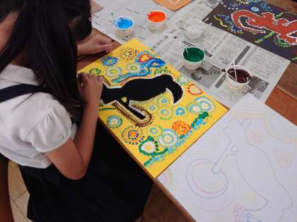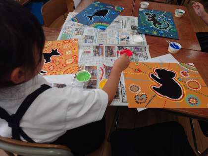 多文化共生の学習の一つとして、オーストラリアの先住民族アボリジニが描くアボリジナルアートに挑戦しました。