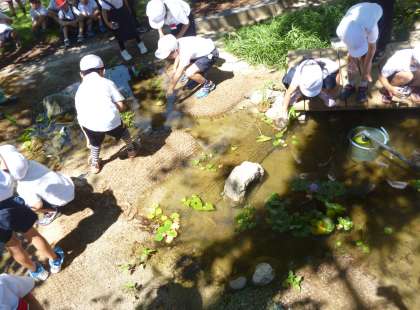6日の5時間目、1年生が、ビオトープに子メダカを放流しました。
