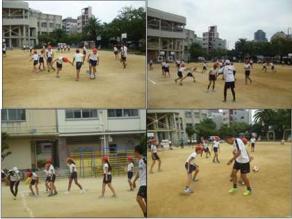 大阪市スポーツ振興事業の一環で、セレッソ大阪の鈴間コーチ、安食(あんじ)コーチ、有富コーチの3名が、特別講師として来校されました。トップアスリートによるサッカーに関する基礎練習を楽しみながら学習しました。何気ない、背中タッチゲームというウォーミングアップでも、サッカーに重要な、フェイントの動きが入っており、子どもだけでなく教員も大変勉強になりました。