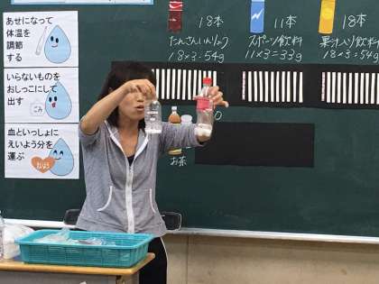 2学期は、「飲み水について」授業をしていただきました。普段飲んでいる炭酸水にどれだけの砂糖が入っているか。砂糖は体にとってよいこともあるが、取りすぎると体に悪影響を及ぼすことを学びました。実際の掲示物を使って学習したので、子ども達もたいへんわかりやすかったようです。感想の一部も掲載していますので、ご覧ください。