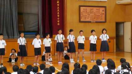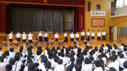 9月の初めに後期代表委員の紹介がありました。代表委員の児童は緊張した表情で学校をより良くするためにはどうすればいいのか、自分の考えを全校児童に発表していました。