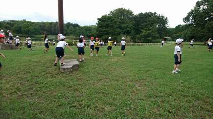お昼ご飯は1年生と2年生のたてわり班でお弁当とお菓子を食べました。食べた後は、2年生が考えた遊びを班で楽しんでいました。