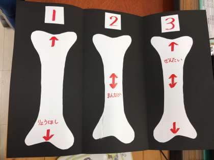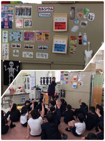 養護教諭の指導のもと、具体的な掲示物やクイズを通して、骨の大切さや密度を強くする方法などを学びました。この学習を、今後の給食、生活上の飲食や運動で生かしてほしいと思います。