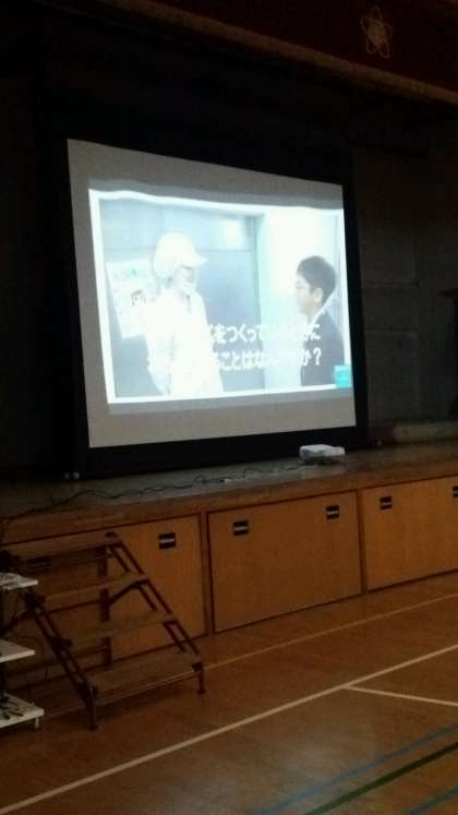 児童集会では、給食調理員さんがみんなの給食を作っている様子を見てもらいました。