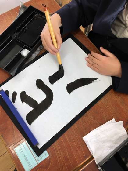曲がりの筆使いと、折れの筆使いに気をつけて書きました。初めてのカタカナに苦戦しながら書きました。