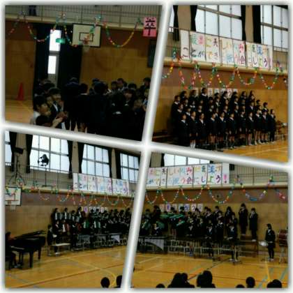 6年生からは、雑巾と合奏「ドラゴンナイト」、合唱「最後のチャイム」のプレゼントがありました。在校生からは、寄せ書きと合唱「栄光の架け橋」のプレゼントがありました。歌の途中で泣き出す6年生がいるほど感動的でした。