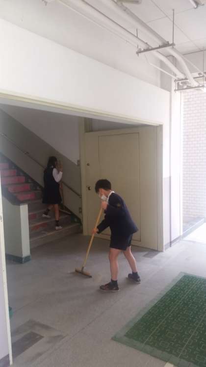 お昼の清掃活動です。3年生から6年生までの縦割り班で清掃活動を行っています。