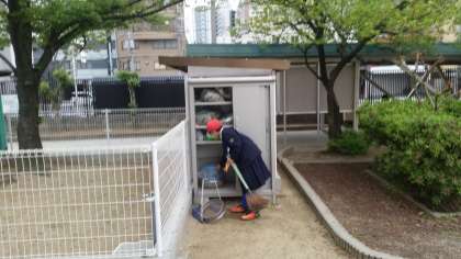 飼育委員がうさぎ小屋のそうじとえさを取り替えています。