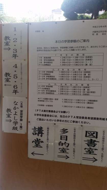1年生は給食参観と学級懇談会、2年生から6年生は学習参観と学級懇談会です。