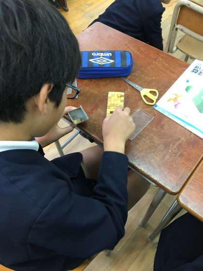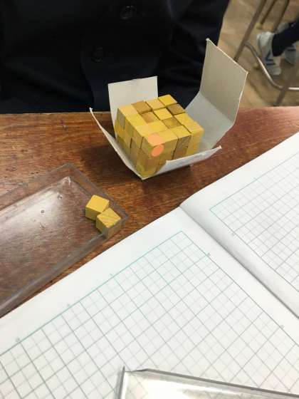 直方体と立方体の体積を比べるために、1㎤の大きさのブロックを詰め込みました。