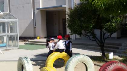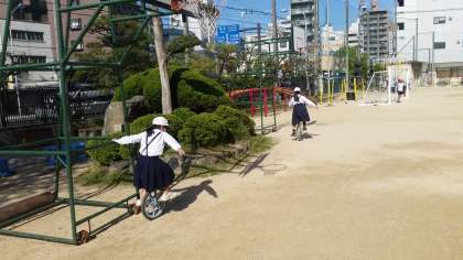 一輪車の練習をしています。低学年も楽しそうに校庭で遊んでいます。