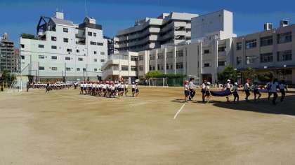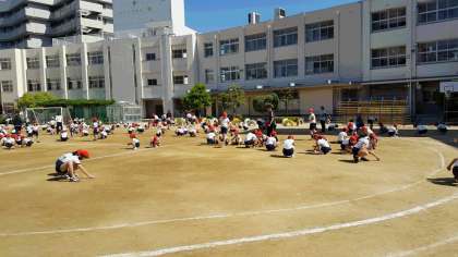 運動会に向けて毎日がんばっています。今日の体育朝会は入場行進の練習と運動場の石拾いです。