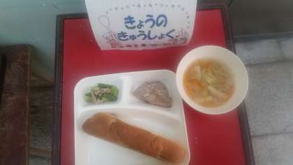 今日のメニューは、カツオのガーリックマヨネーズ焼き、スープ、グリーンアスパラガスのソテー、レーズンパン、牛乳です。みんなしっかり食べましょう。