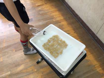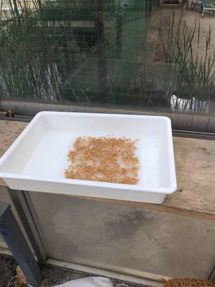 温室で温めたり毎日水を変えたりして芽が出るのを待っています。