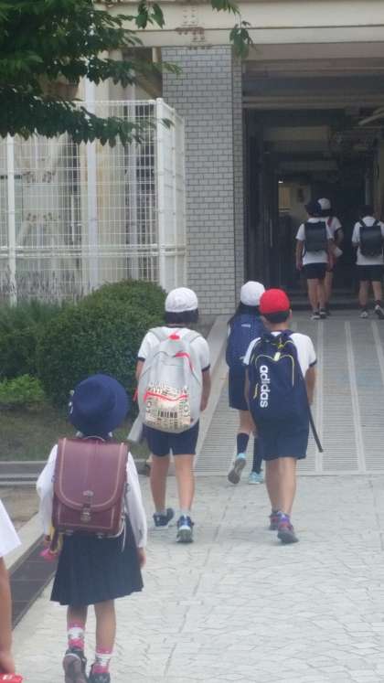 ランドセルに交じってリュックサックで登校しているのは5年生です。