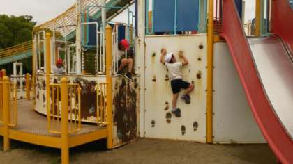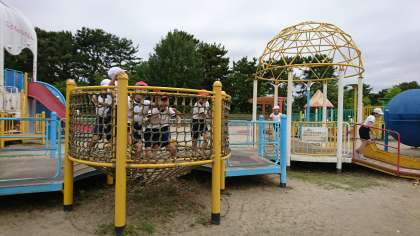 みんなは、遊具を使って活動しています。雨が降らなくて本当によかったです。