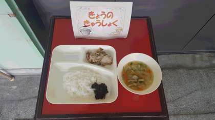 今日のメニューのぶたにくのごまみそやきは、ゴマが香ばしくみそとぶたにくがよく合っておいしかったです。すまし汁が絶品でお汁の味がよくたけのこの食感とよく合いおいしかったです。のりのつくだには、給食室で手作りしたつくだにでこれだけで、ごはんが食べられました。