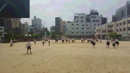 梅雨の晴れ間、昼休みの運動場は大賑わいです。