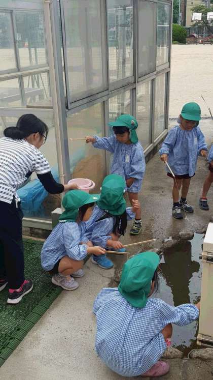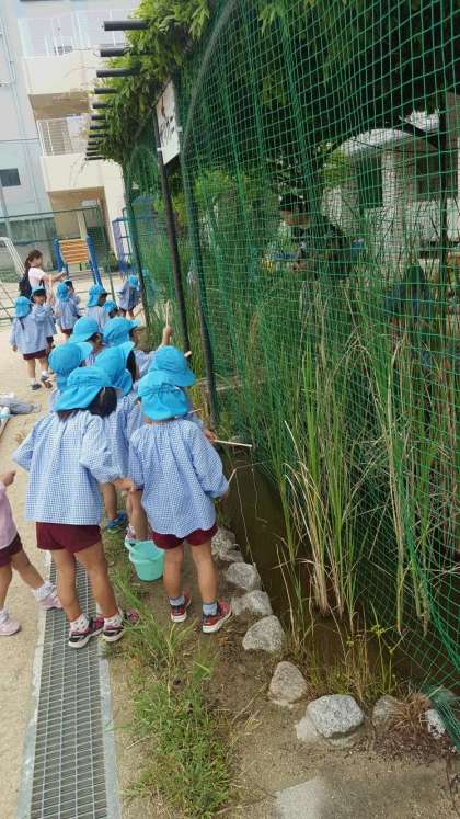 大江幼稚園の園児の皆さんが天小の「ザリガニ池」にザリガニを釣りに来ました。