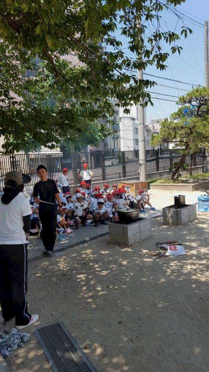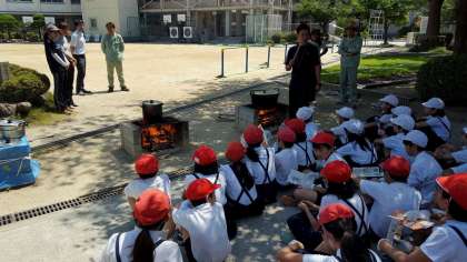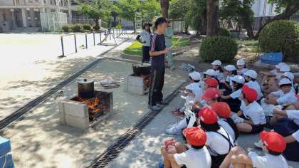 かまどでジャガイモを炊いてスープにしました。理科の学習で学んだ通り、空気の通り道を作って強い火力で煮込みました。