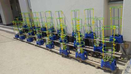 1年生のあさがおもつるが伸びだして支柱をつけました。なに色の花が咲くか楽しみですね。