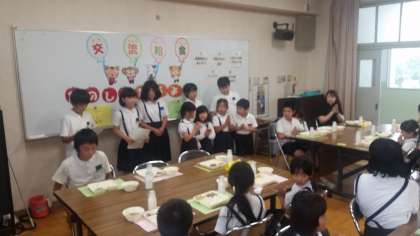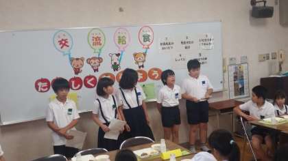 1年生の「いただきます」のあいさつで交流給食がはじまりました。