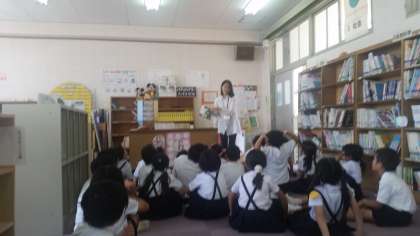 写真は学校図書館補助員の先生に読み聞かせをしていただいています。