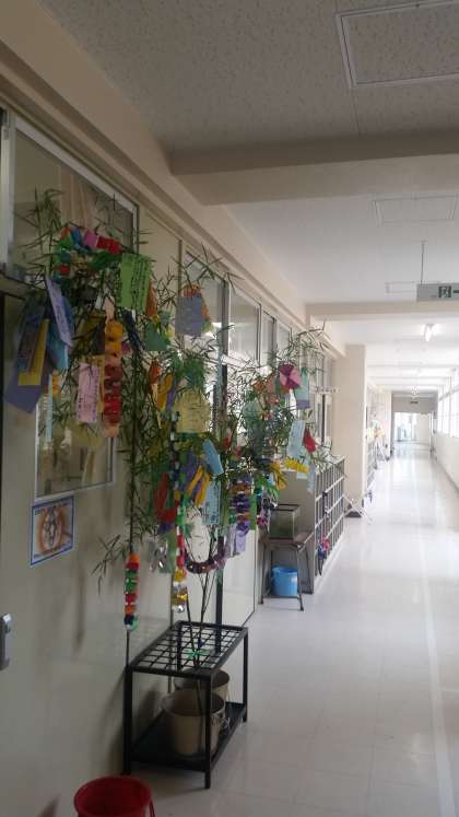 七夕が近づき、2年生の教室前にも短冊に願いを書いた竹が飾られています。