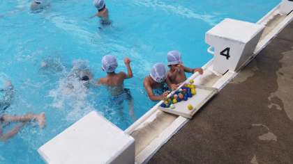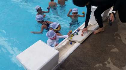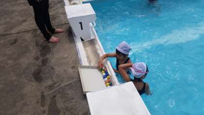 カニさんのように「ブクブクパー」と息継ぎの練習や「宝さがし」のような活動をとおして、安全で楽しくもぐったり、浮いたりする心地よさを学習することができます。