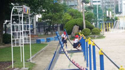天小広場にあるビオトープや鉄棒で遊んでいます。