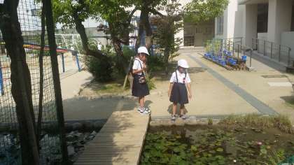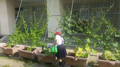 ザリガニ池の観察やゴーヤの水やりをしています。