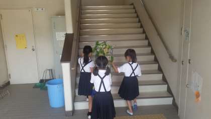 1年生は育てた朝顔を教室の前まで運んでいます。懇談で保護者の方に持って帰ってもらいます。