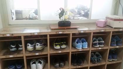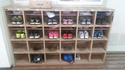 教室の前のくつ箱です。どの教室のくつ箱もきれいにそろえて靴が入っています。