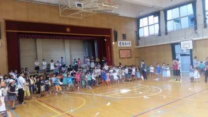 体育館で、一生懸命作った紙飛行機を飛ばしています。
