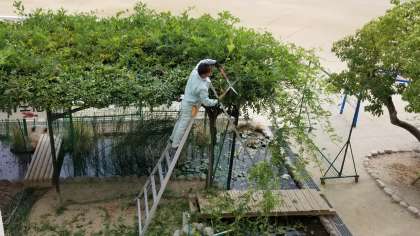 管理作業員さんがザリガニ池の棚の葉をきれいにしてくれています。