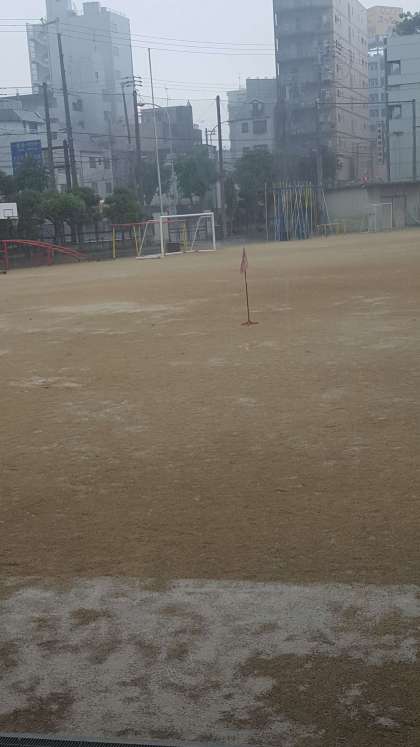 空が真っ黒になったかと思うと、すぐに大粒の雨が降ってきました。運動場もびしょびしょです。残念ながら今日は運動場は使えません。教室で静かに過ごしましょう。