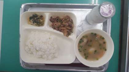 今日の給食は、プルコギ、トック・チンゲンサイともやしのあまずあえ、ごはん、牛乳です。残さずしっかり食べましょう。