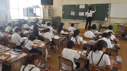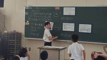 本日4時間目は、3年2組で教育実習生による研究授業が行われました。教科は算数で単元は「かけ算のひっ算」でした。2段階の式の1つの式への表わしかたについて学びました。みんな一生懸命に考えて、かっこを使って簡単に計算できる方法を見つけていました。