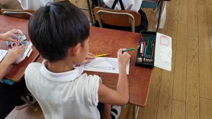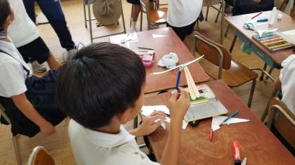 色を塗り、正確に切り取り、張り付けてバランスのよいトンボを作っています。