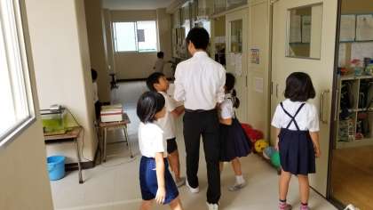 廊下では教育実習の先生と話をしています。