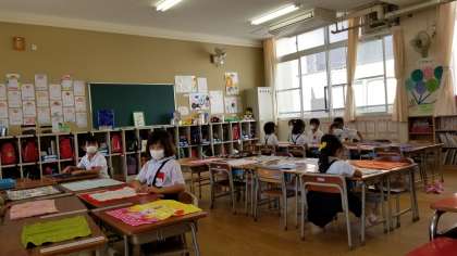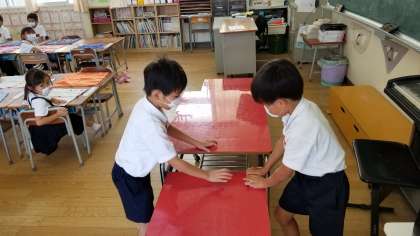 配膳台を拭いている児童がいます。他の児童も静かに待っています。