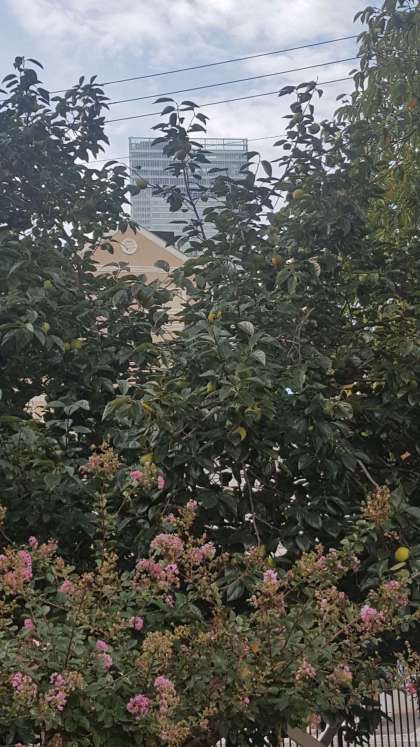 こちらは学校の朝の風景です。気温は25度、湿度49%、天気は今のところ晴れています。サルスベリの花が咲き、柿の実が色づき始めました。この後、雨の予報が出ています。
