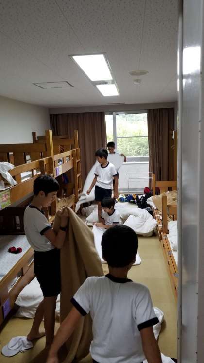 いよいよ自然体験学習も最終日です。寝具の整理をしています。